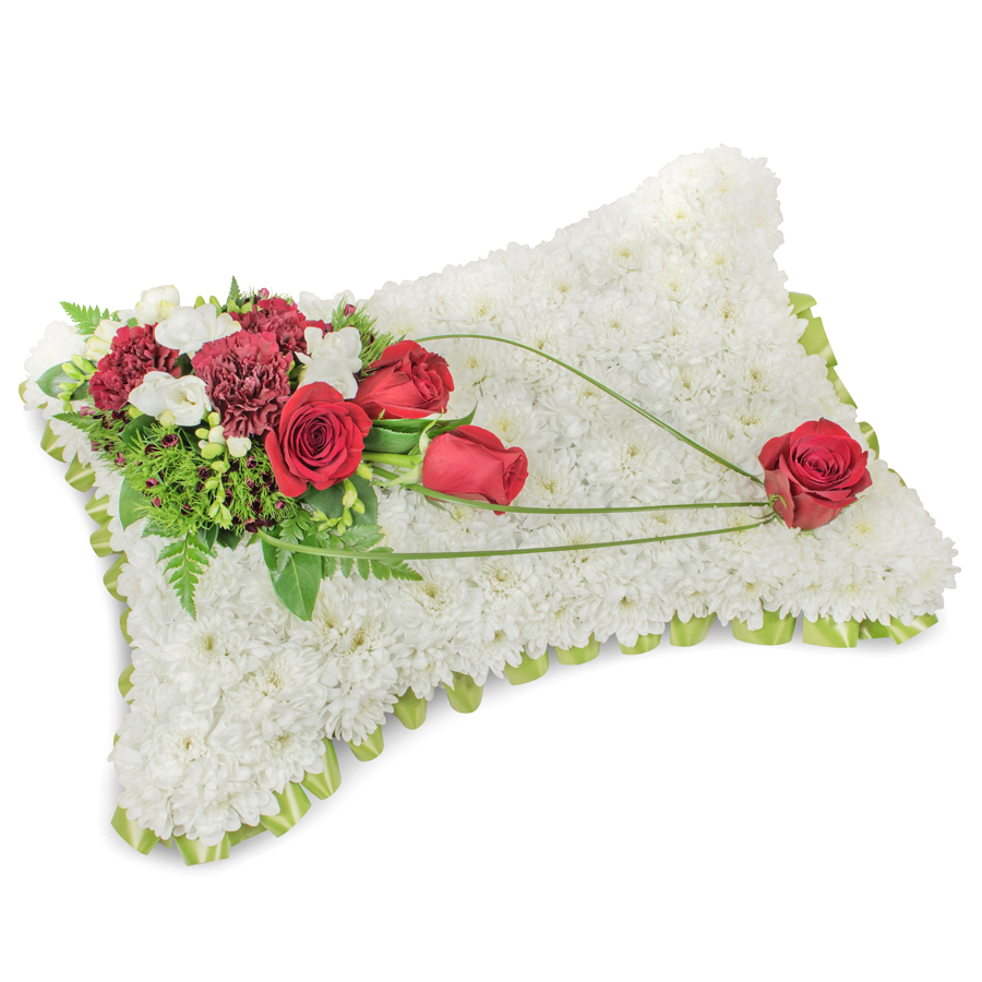 Express your deepest condolences with our stunning sympathy bouquet, thoughtfully crafted to convey your heartfelt sentiments. This unique arrangement features a harmonious blend of white chrysanthemums, red roses, white freesias, dark red carnations, dianthus, and delicate bear grass.
